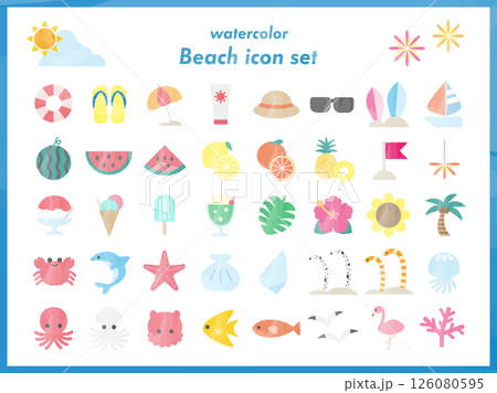 シンプルなビーチと海の生き物水彩風ベクターイラストセット