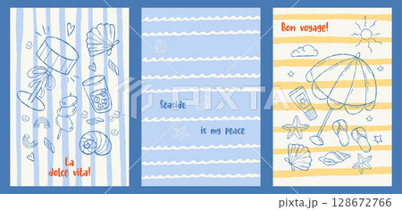 Retro summer Posters. Dolce vita Hand drawing. Isolated Mediterranean aesthetics postcards with beach vacation food, drinks and quotes. Vector outline Vintage vertical marine cards. Not AI