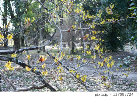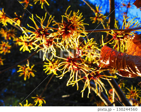 Witch hazel or Hamamelis virginiana in the spring. Tree in bloom.