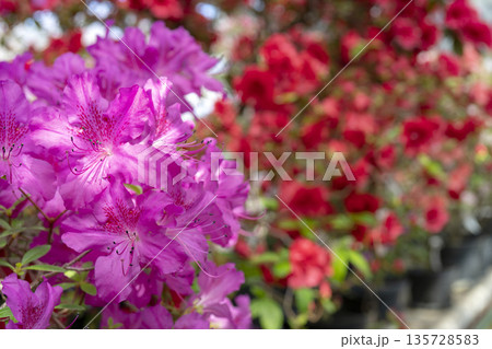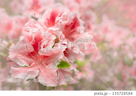 Blooming pink rhododendron (azalea), close-up, selective focus, copy space.