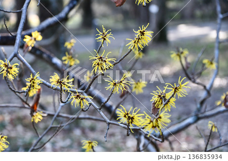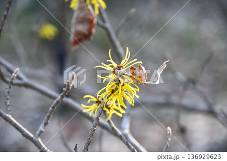 Close-up of Witch Hazel or Hamamelis virginiana blooming in spring. A deciduous tree in the Hamamelidaceae family. Yellow flowers in early spring. Spring floral background.