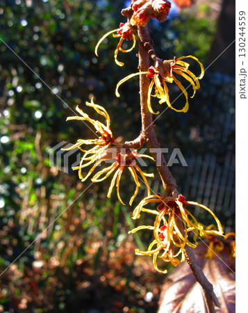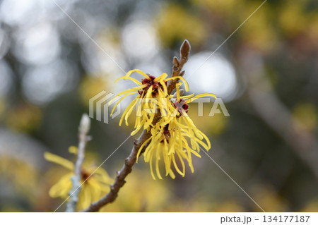 Close-up of Witch Hazel or Hamamelis virginiana blooming in spring. A deciduous tree in Hamamelidaceae family. Yellow flowers in early spring. Spring floral background.