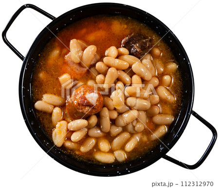 Asturian rich beans stew Fabada with pork shoulder, morcilla and chorizo