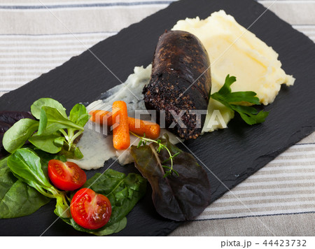Spanish and Argentine MORCILLA blood sausages with potatoes and chile sauce