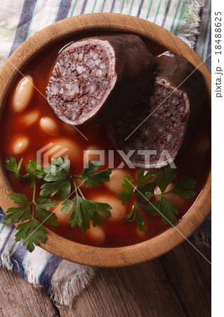 Delicious dish of Spanish cuisine is Fabada soup, made from white beans with smoked pork knuckle and Choriso and Morcilla sausage