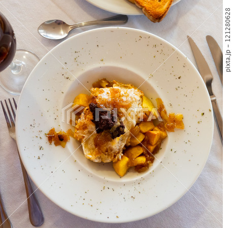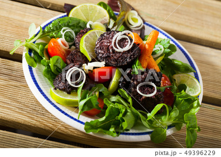 Delicious Catalan blood sausages with grilled onion served on plate. Morcilla con cebolla