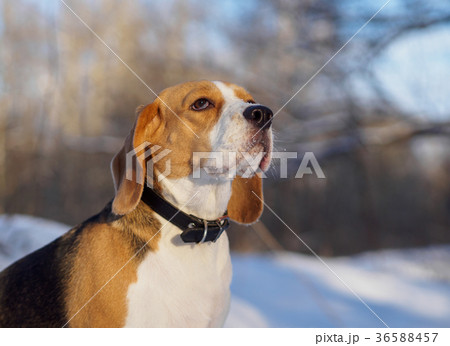 Beagle dog walking in the winter forest