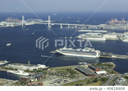 日本の横浜都市景観 横浜港や出港した豪華客船「ダイヤモンド・プリンセス」などを望む