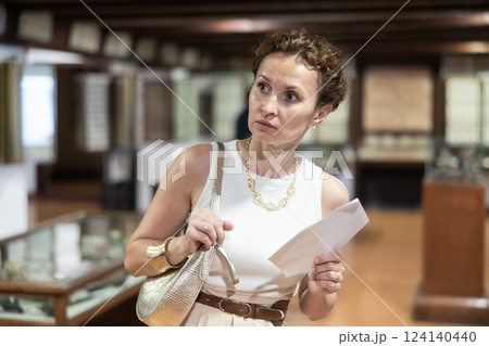 Portrait of beautiful woman looking at pictures and amaze in museum, holding guide book