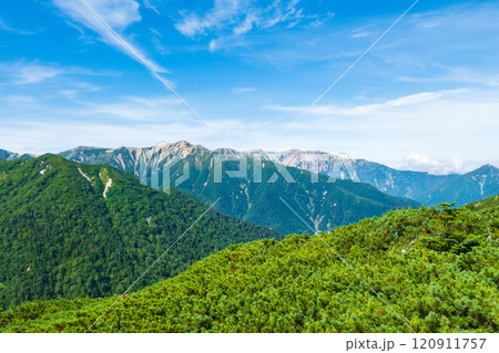 青空に浮かぶ白い雲の影に覆われた盛夏の赤岳
