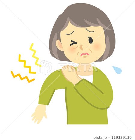肩に手を当て腕が上がりにくい中年女性の様子_四十肩や五十肩、肩こりの老化症状