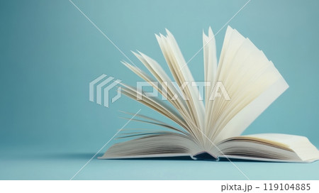 Open Book with Pages Turning Against a Soft Blue Background, AI