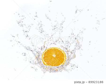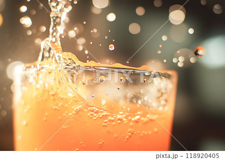 グラスに注いだオレンジジュースと弾ける水滴_1