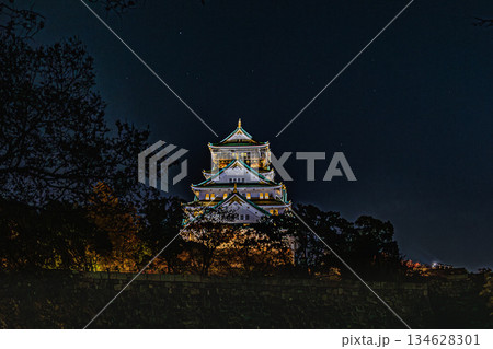 ライトアップされた大阪城の美しい夜景風景