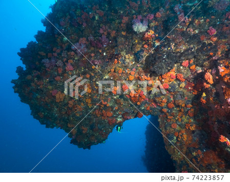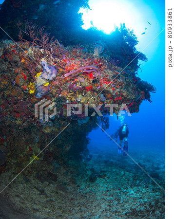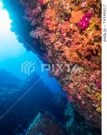 珊瑚に覆われた張り出した海中の岩 (メルギー諸島、ミャンマー)