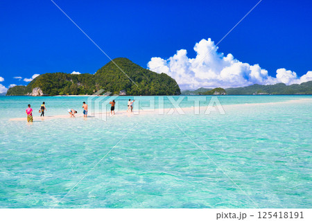 パラオ共和国 カヤンゲルの白い大きな砂浜と透明なブルーの海と環礁の島