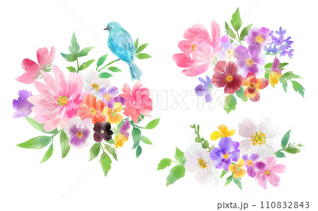 青い鳥とパンジー、カラフルな草花の背景用ベクターイラストセット