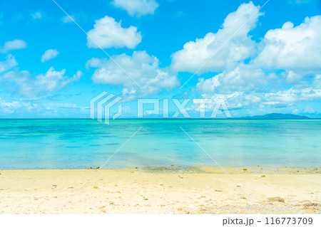 ブセナ海中公園の白い砂浜と青い海 沖縄県名護市
