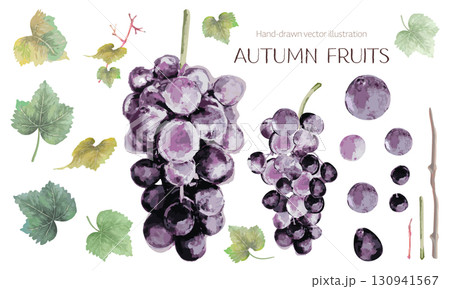 紫ブドウ(巨峰)の果実と葉の水彩イラスト。セット。