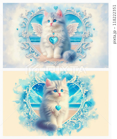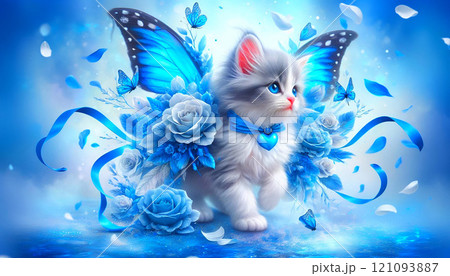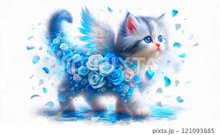 かわいいペルシャ子猫が薔薇と天使の翼をつけ青い花びらと海に囲まれたアートイラスト背景