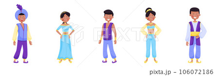 People Characters Wearing Arabic Clothing with Woman in East Apparel and Jinn with Mandil on His Head Vector Set