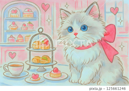 ラグドール子猫がかわいいピンクリボンつけプリンセスアフタヌーンティーを楽しむ手描き風イラスト水彩画