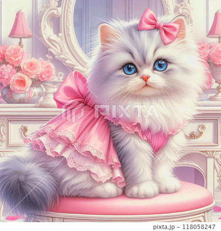 かわいいペルシャ猫がピンクドレスを着て薔薇に囲まれたロココプリンセスドレッサーのスツールに座っている