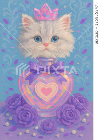 リボンハート香水ミヌエット子猫とティアラとカメリアとパールとダマスク柄のかわいい手描き風油絵イラスト