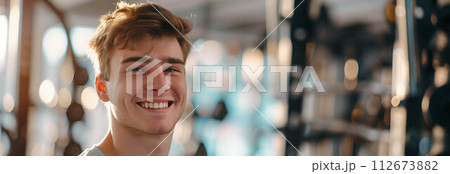Portrait of young handsome athletic man standing in gym, looking at camera, smiling