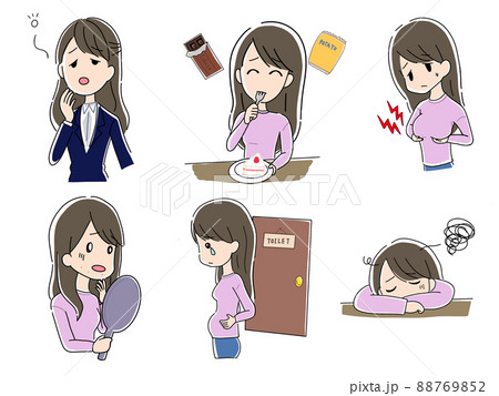 お腹のハリや便秘などお腹の悩みを持っている若い女性のイラストセット