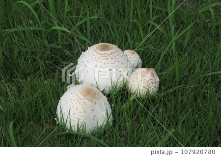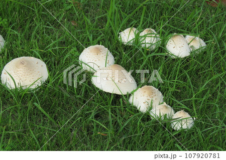 公園の芝生に生える白いキノコ(オオシロカラカサタケ)
