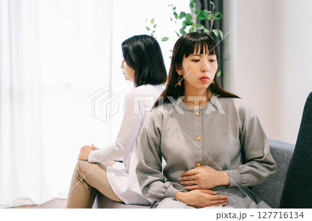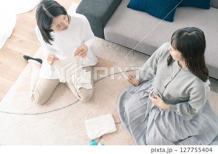 ベッドに寝転び肌着を挟んで赤ちゃんが待ち遠しい母と娘