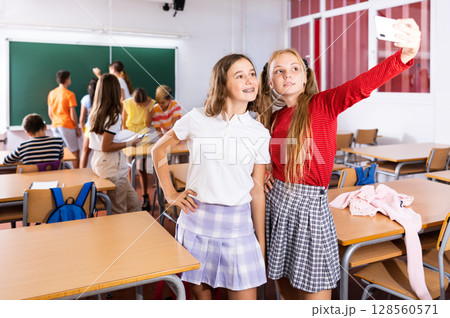 Cheerful girls classmates taking funny selfie with phone during break