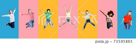 Carefree Children Jumping Posing Together On Colorful Studio Backgrounds, Collage