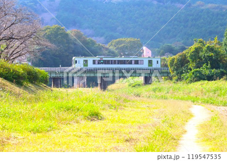 おごせ町の鉄橋を渡る一両編成の電車と里山の風景