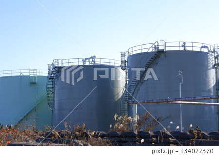 Large industrial oil storage tanks in field with blue sky at petroleum facility