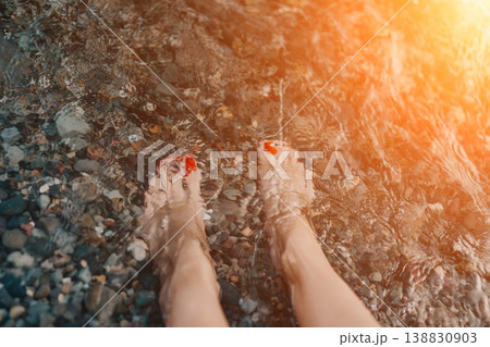 Feet water pebbles, relaxing in shallow clear water over colorful stones with warm sunlight.