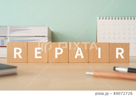 修理のイメージ|「REPAIR」と書かれた積み木が置かれたデスク
