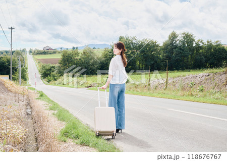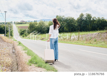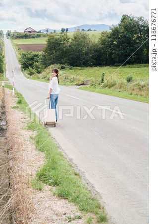 田舎道でキャリーバックを持っている若い女性