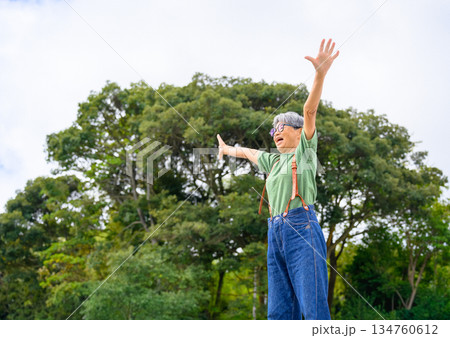 屋外で喜ぶ高齢女性