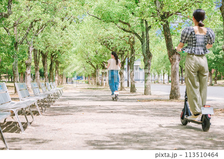 電動キックボードで並木道を走る女性