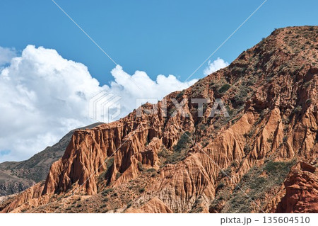 Red rock mountain in Kyrgyzstan with blue sky and white cumulus clouds