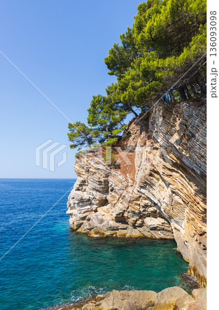 Sunlit coastal cliff with pine trees over turquoise water