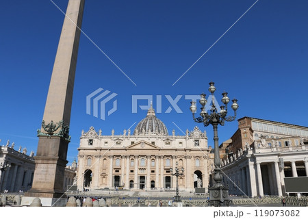 Facade and dome of The Papal Basilica of Saint Peter in the Vatican (Basilica di San Pietro), a Renaissance style church in Vatican City, within the city of Rome, Italy