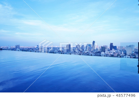 高層階から見た世界都市バンコクの街並みと屋上にあるプールのイメージ写真