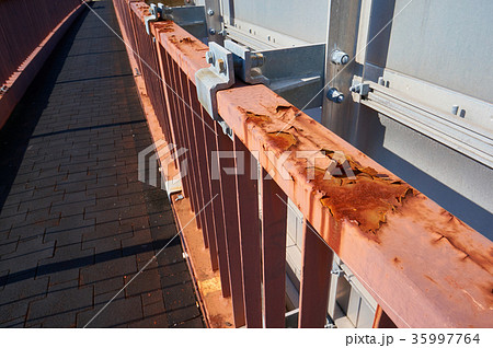 歩道橋の手摺の塗料がひび割れ錆びる