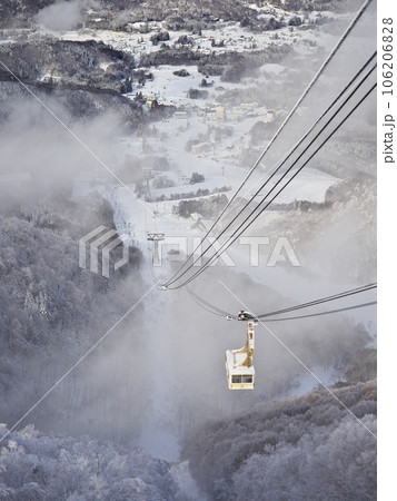 スキー場ロープウェイ山頂駅から見下ろす急斜面コースと山並み (長野県、竜王スキーパーク)