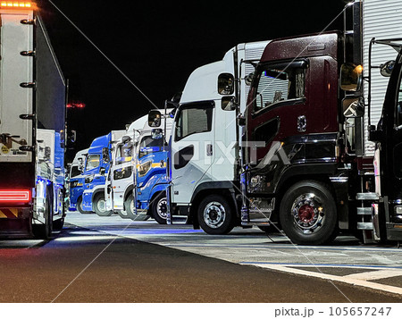 物流イメージ 夜の高速道路のパーキングエリアのトラック