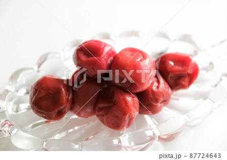 ガラス皿に盛り付けた複数の梅干し