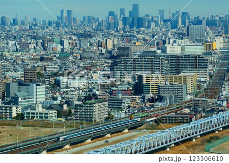 六郷川橋りょうを渡る特急踊り子の俯瞰撮影